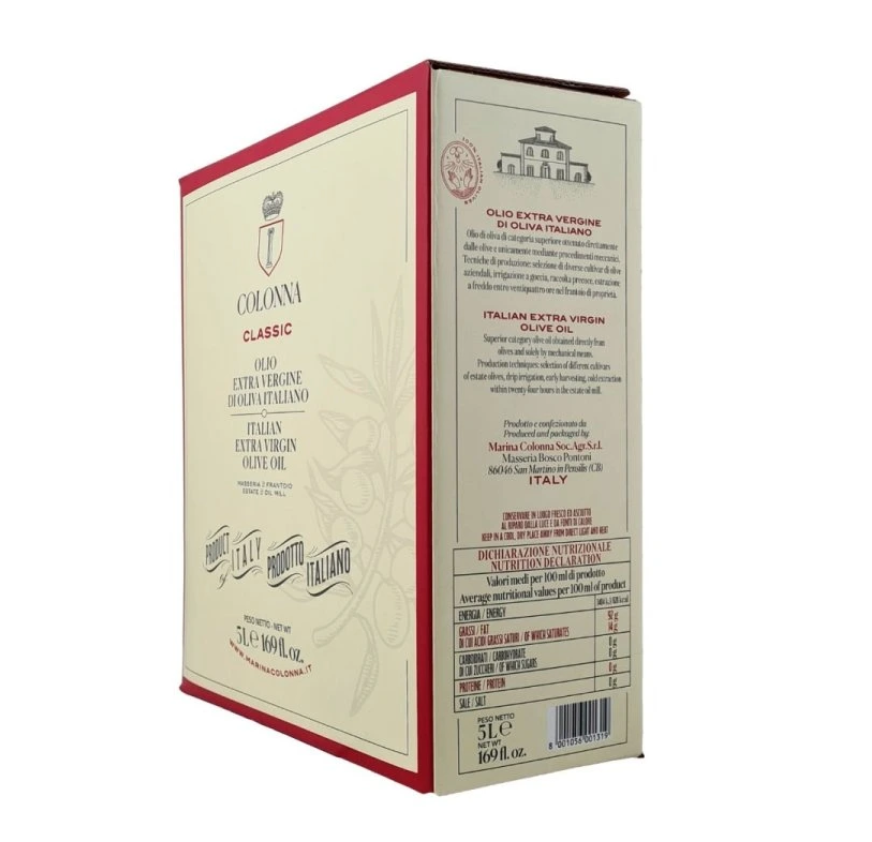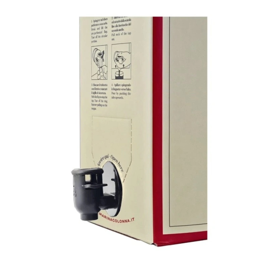 Das Bag-in-Box-Format bietet dank seines luftdichten Innenbeutels optimalen Schutz vor Oxidation und bewahrt so die Qualität und die sensorischen Eigenschaften des Öls über lange Zeit. Der integrierte Zapfhahn gewährleistet eine präzise und hygienische Entnahme, reduziert Verschwendung und verhindert Verunreinigungen. Diese Verpackung ist leicht und vollständig recycelbar und minimiert zudem die Umweltbelastung. Mit der Wahl von Colonna Classic in der Bag-in-Box-Verpackung entscheiden Sie sich für Qualität, Komfort und Nachhaltigkeit.